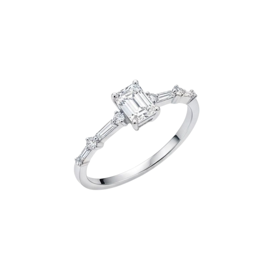 Add a touch of elegance and sophistication with this stunning lab-grown diamond ring. Featuring a radiant emerald-cut center diamond with sparkling baguette side stones, this 10K white gold ring embodies timeless beauty and ethical luxury—perfect for modern women who cherish style and sustainability.