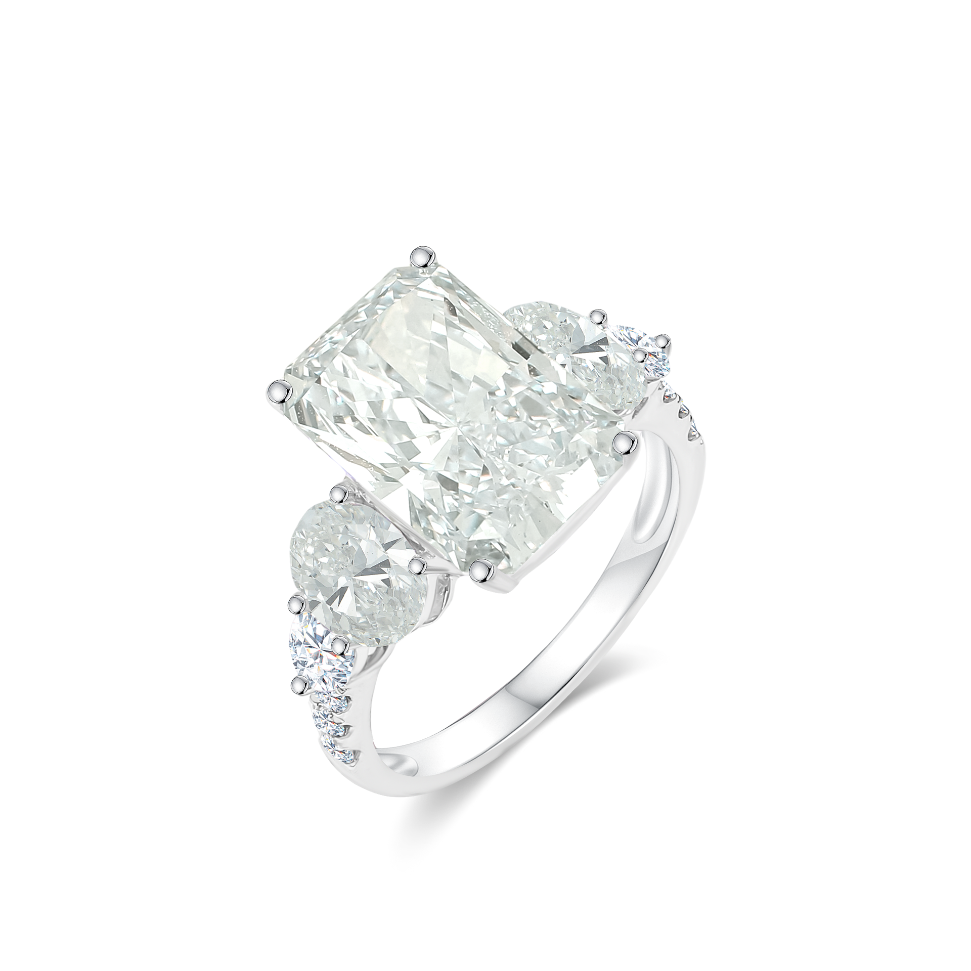 - Radiant-cut center diamond with oval and round side diamonds for extraordinary brilliance